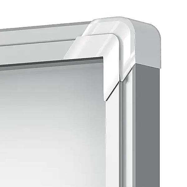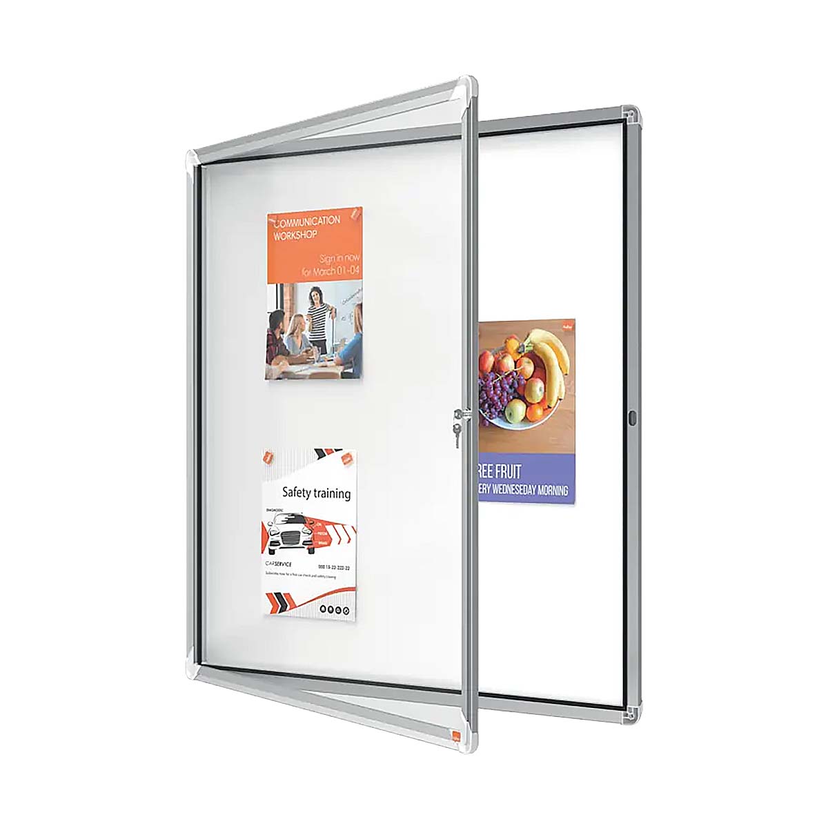 Vitrine para uso no exterior, com estrutura em alumínio, fechadura, porta de batente em vidro e superfície em aço lacado branco para escrita a marcador e limpeza a seco ou afixação com magnetos.